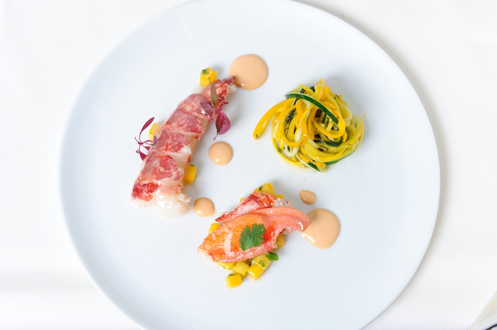 Homard breton tied au citron vanillé avec des mangues à la coriandre et courgettes