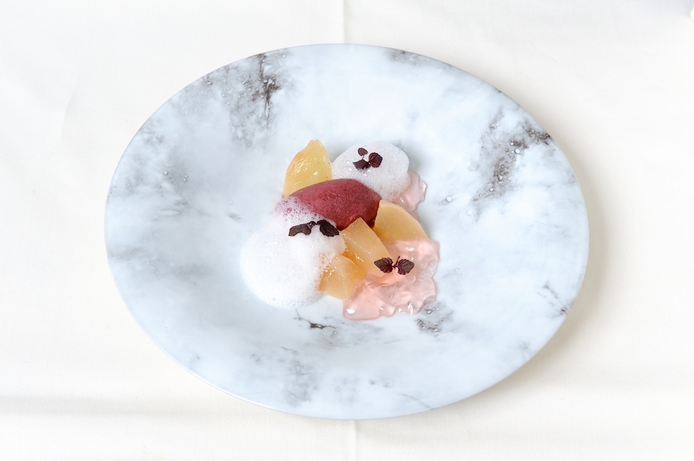 白桃のマリネ 桃のジュレとクレームを添えて赤紫蘇のソルベとともに(飯塚シェフ)