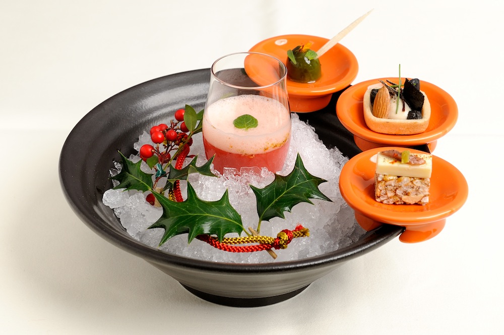 L'Amuse-bouche et Gaspacho de Saison (par Chef WATANABE)いばらキッスとフルーツトマト、セロリのガスパチョ カンパリオレンジのエキュームをのせて