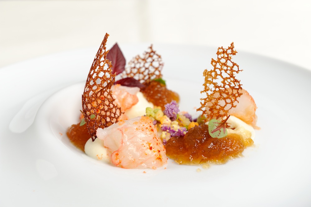 Langoustines laque, Taboulé et Crèmeaux de Chou-fleur sur une gelée de crustacés (par Chef FURUYA)駿河湾の赤座海老のラケとそのコンソメジュレ カリフラワーのタブレとクレムー