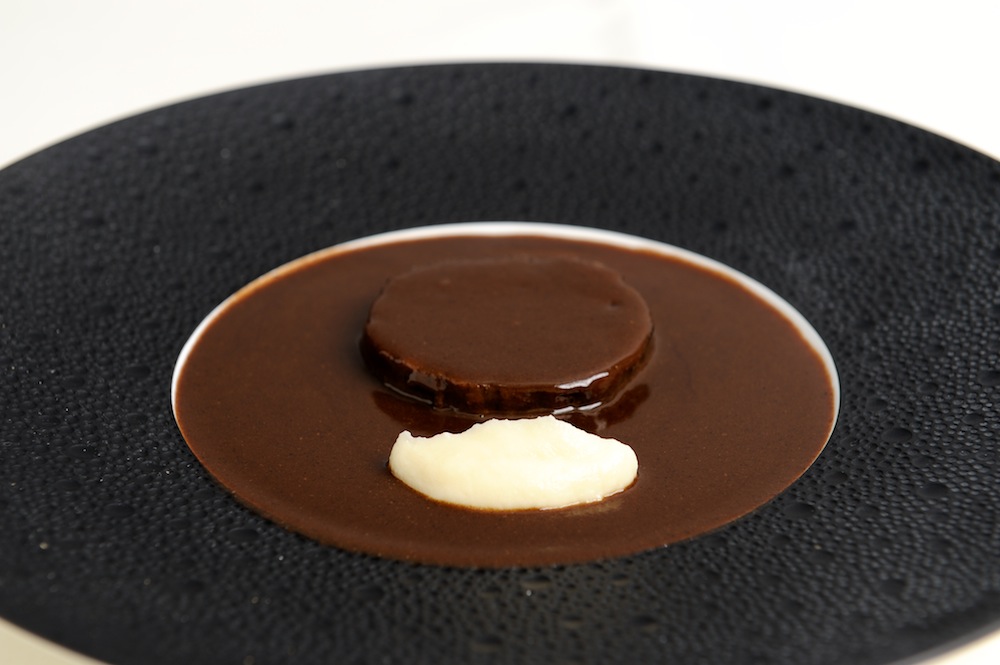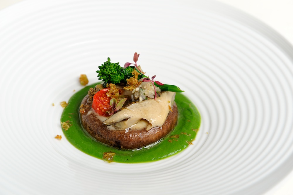 Ormeau braiser, purée de fleur de corza et oignon nouveau, servir avec tige de pétasite du Japon (par Chef SHINDO)島根県産黒鮑 柔らかく蒸し焼きにし 菜の花と新玉葱のピューレにのせ 蕗の薹の苦味をアクセントに