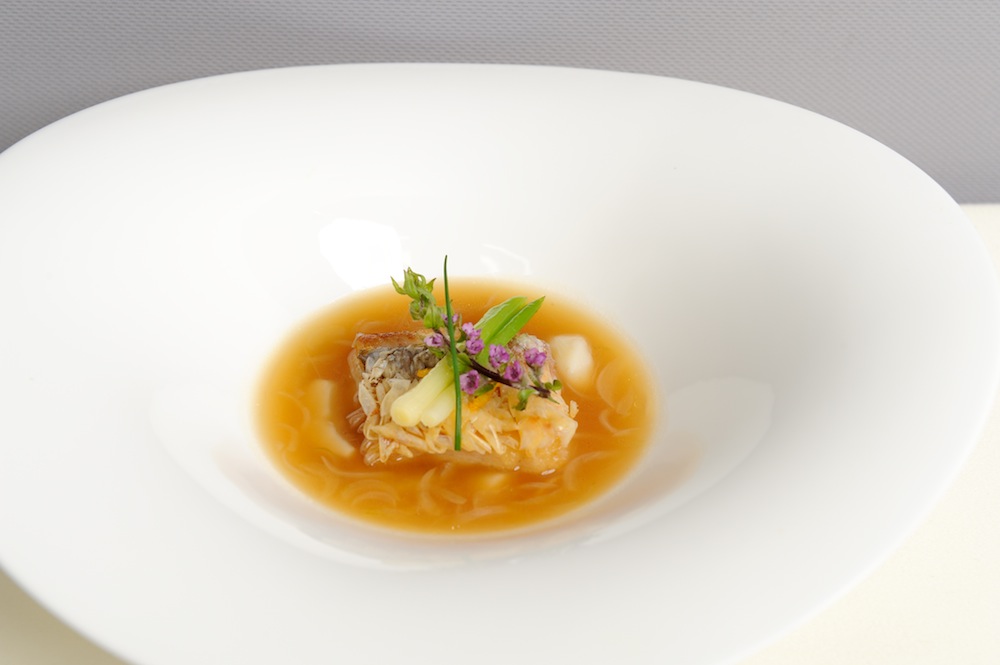 L'Amadai à la Nage (par Chef WATANABE)山口県萩直送釣り甘鯛 うろこ付きで香ばしく焼き 百合根と枯木ゆずのナージュ仕立て