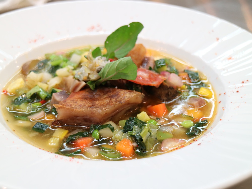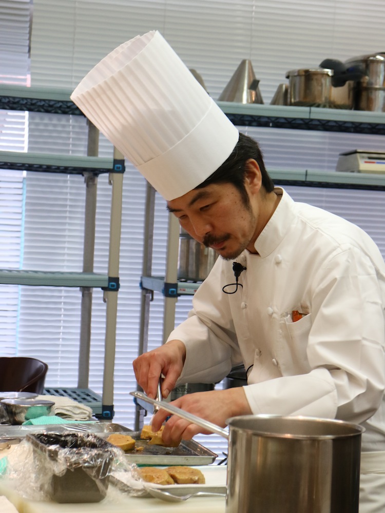 まずは「Le traiteur024 ル・トレトゥール024」のオーナーシェフ・大西孝典氏が、旬のグリーンアスパラガスをフォワグラと合わせ、目にも美しいテリーヌを、「Q.E.D. CLUBフレンチ」シェフの大村龍一郎氏が、17種の野菜を豚頭のコンフィと煮込んだガルビュールをそれぞれ披露してくださいました。