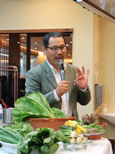 17種のほとんどが「ビオファームまつき」の野菜とのこと。お2人と親交があるというビオファームの松木一浩氏も、生産者として講習会に参加してくださり、色とりどりの新鮮な野菜を前に、ご自身の栽培のこだわりを語ってくださいました。