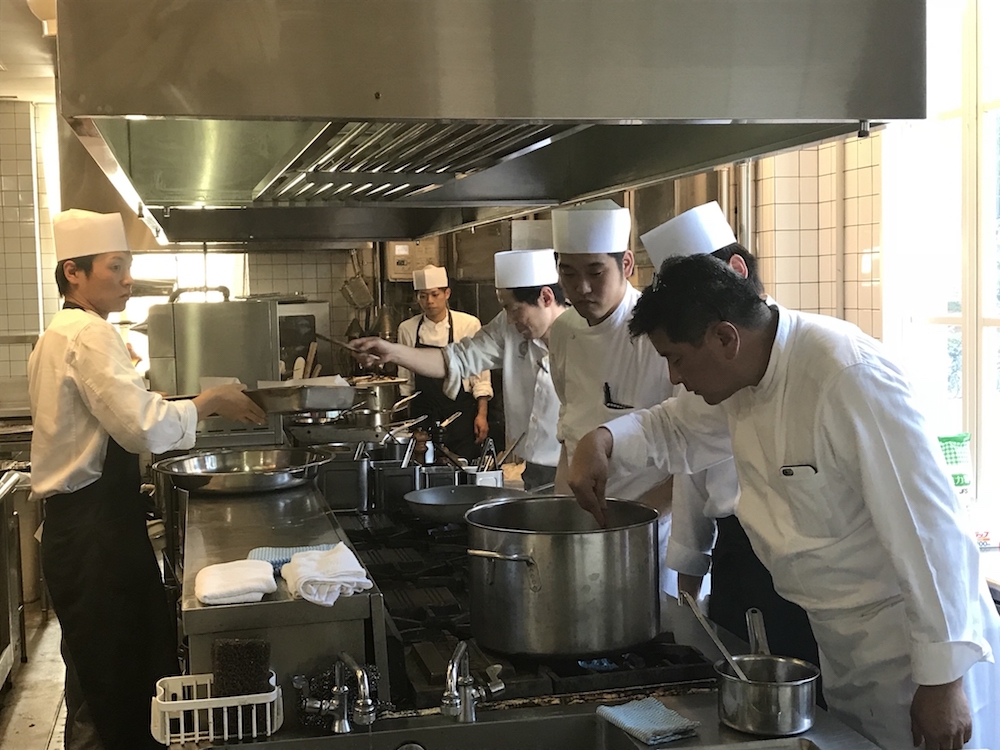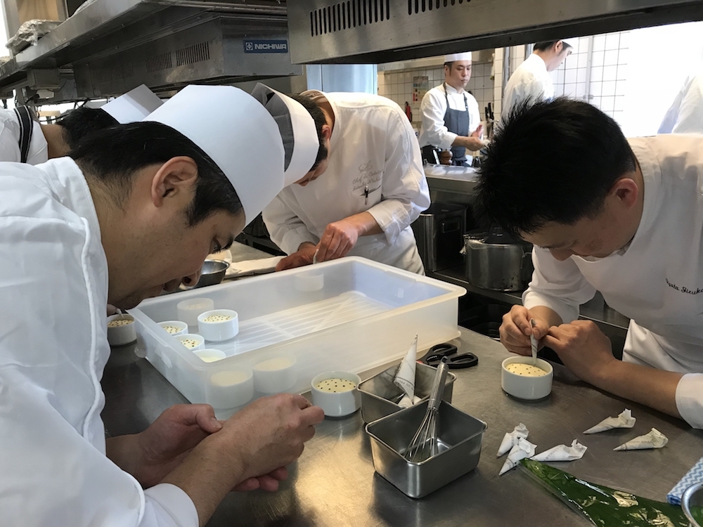 京都フランス料理研究会主催のこのイベントは、東京のシェフと共にフランス料理界を盛り上げ、京都のお客様に東京のトップシェフの味も楽しんでもらおうという企画ですが、それと共に会員の店の若いスタッフにも、一緒に仕事をすることによって交流の場や勉強の機会を作ることも目的の一つです。