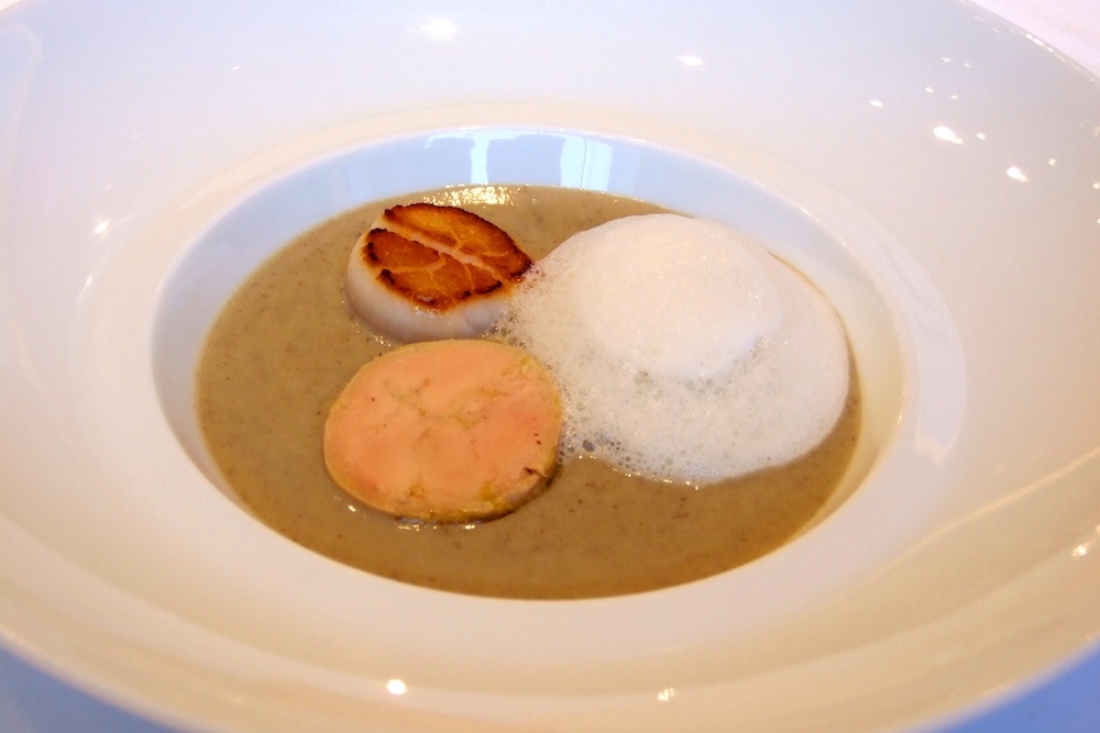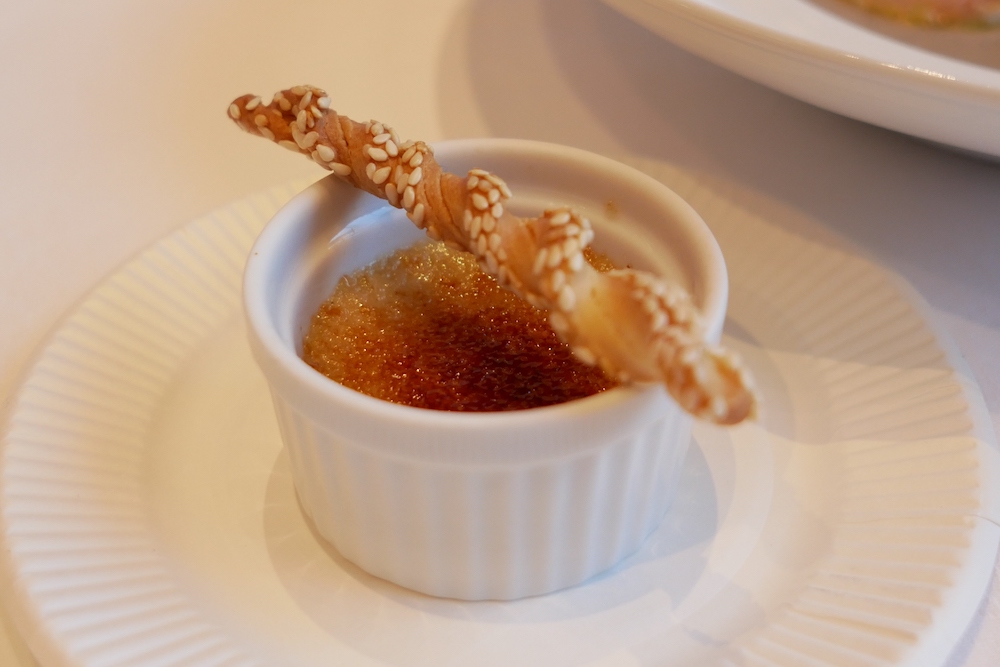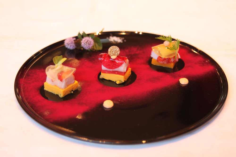 ~珠玉の前菜メニューを極めよう!~ と銘打った今回は、まず松本シェフによるトピナンブール、フォワグラ、貝柱を使った一品。そしてコンテチーズのクレームブリュレ。それぞれの素材の扱い方や調理方法に対するこだわり、考え方、そして感性を生かした調理などのお話と共に料理を仕上げていきました。