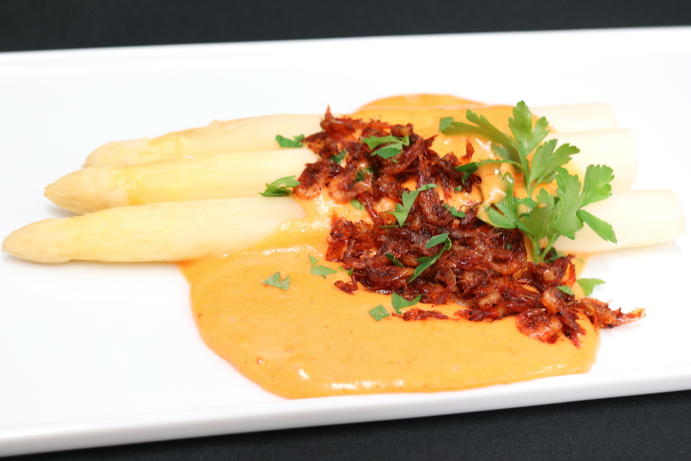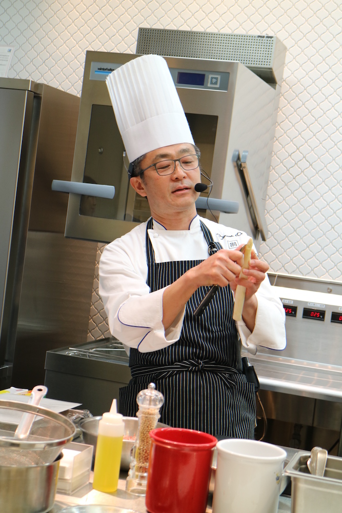 川端シェフは「アスペルジュブランシュ 桜海老オランデーズソース」を。