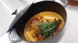 今回、講師を務めていただくのは「シェ・シミズ」のオーナーシェフ 清水 郁夫 氏。フランス ノルマンディ地方発祥の伝統料理で、フランス料理の芸術とも言われる「仔鴨のルーアン風 Caneton à la Rouennaise(カヌトン・ア・ラ・ルアネーズ)」をご披露いただきました。