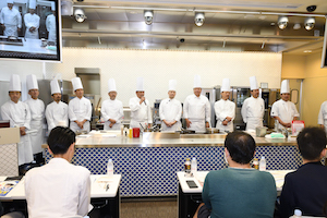 第7回目となるクラブ・アトラスのシェフによる料理講習会が開催されました。今回のテーマは「フランス料理基礎の伝承とプロ育成」。アトラスの会のシェフの方々からの質問やポイント解説を挟みながら調理デモが進みました。